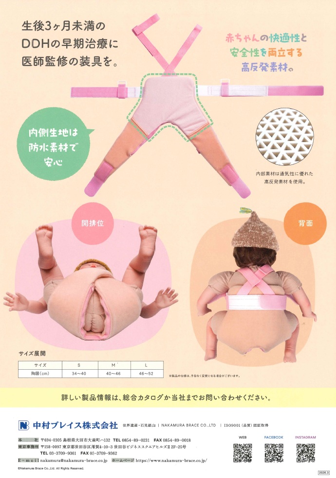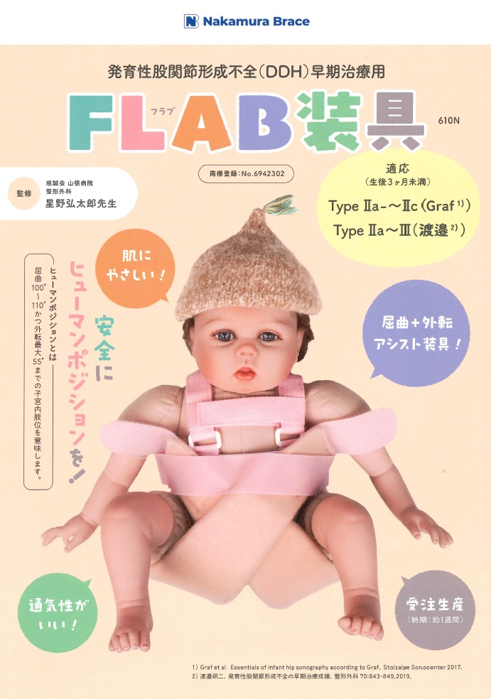 | 製品「FLAB装具」(監修:星野弘太郎) 赤ちゃんの股関節脱臼の治療装具です。Graf先生が使用している実物を後藤昌子先生から私が譲り受け、忠実に採型して作製しています。素材は通気性の良いものに変えましたが、赤ちゃんの肌に触れる表面はファブリクにするようGraf先生から厳守するように指示を受けております。尿で汚れるため、裏地を防水の生地で裏打ちして、中身が汚染しないように工夫されています。 この装具の適応は生後3ヵ月未満で、Graf先生はGraf分類タイプIIa-~IIc(骨化が未熟~脱臼寸前のもの)、渡邉研二先生はタイプIIa~III(骨化が未熟~完全脱臼)としています。高位脱臼には適応がありません。 股関節が完全脱臼している場合には通常リーメンビューゲル(Pavlik harness)で治療しますが、股関節を開きすぎると大腿骨頭軟骨を障害することが約10%あります(骨頭壊死)。小児整形外科医はこれを非常に恐れています。ですので、完全に脱臼していない場合には気軽には装着できません。タイプIIc(脱臼寸前)やタイプD(脱臼直後)において、この装具は非常に良い適応です。おしりを包み込む形状なので、股関節の開きすぎ(骨頭壊死の原因)を予防できます。3サイズありますので、在庫をそろえておけば、エコー診断したその場で治療が開始できます。ちなみにパテントは放棄しております。 |