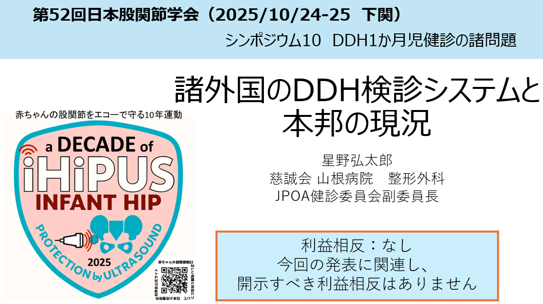 | 2025/10/25発表(山口県) 第52回日本股関節学会におけるシンポジウム10「DDH 1か月児健診の諸問題」の中で、ご指名いただき「諸外国のDDH検診システムと本邦の現況」を発表させていただきました。これから全国的に1か月児健診でも股関節をチェックして整形外科へ紹介するシステムになってゆきます。そのため、今年1年は新しい健診体制について議論して、今後の道筋を明らかにするシンポジウムが多く企画されました。2014年からレビューしてきましたDDH(発育性股関節形成不全)の世界の健診体制も参考とするために数多くご指名いただき発表の機会をいただき感謝します。 これから赤ちゃんの股関節脱臼は、必ずエコーで診断することを原則とするように変化しなければなりません。表紙にもマークを掲載しましたが、「iHiPUS(愛ヒップス)」を提唱してまいりました。「infant Hip Protection by Ultrasound」の略で、「赤ちゃんの股関節をエコーで守る10年運動」です。応援してください。 |