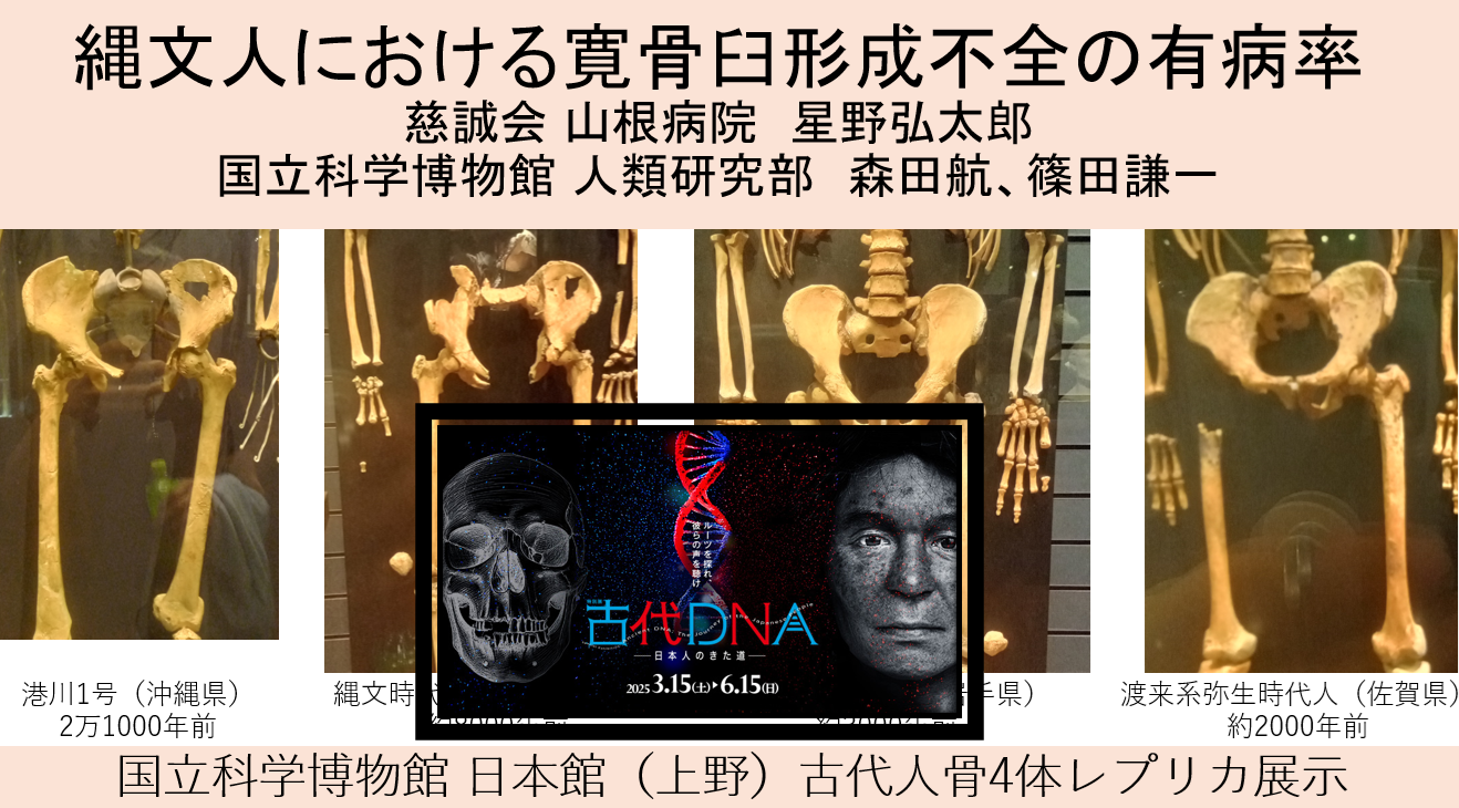 | 2025/5/25発表(東京都) 第98回日本整形外科学会学術総会における一般演題口演73「股関節:その他」にて発表させていただきました。この研究は1月に九州小児整形外科集談会でまず発表し、自信をいただいてこの大きな学会でも発表することができました。なぜ「寛骨臼形成不全」が日本人に圧倒的に多いのか、という大きなテーマを解明する第一歩となると信じています。国立科学博物館と共同研究させていただき、貴重な縄文人骨標本を調査させていただきました。結果、現代人よりも縄文人の方がより高い有病率を示し、寛骨臼形成不全が縄文ゲノムの影響ではないかという仮説の要件を満たしていました。今後の展開をお待ちください。 |