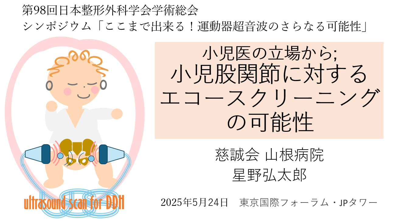 | 2025/5/24発表(東京都) 第98回日本整形外科学会学術総会におけるシンポジウム「ここまで出来る!運動器超音波のさらなる可能性」の中で、小児医を代表しての発表の機会をいただきました。日本最大の整形外科の学会で、聴衆約300人はおられたのではないでしょうか。赤ちゃんの股関節脱臼の診断に、超音波検査(エコー)を使うことで、診断が遅れるケースが確実に減少することをアピールさせていただきました。また日本人に多い寛骨臼形成不全を小学生においてエコーで検診する方法を紹介いたしました。 |
