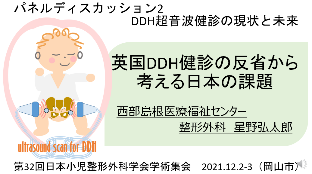 2021/12/2発表(Web開催) 第32回日本小児整形外科学会学術集会が2021/12/2-3で岡山市にて予定されていましたが、コロナ禍のためWeb開催に変更されました。パネルディスカッション2「DDH超音波健診の現状と未来」での発表をご指名いただき「英国DDH健診の反省から考える日本の課題」と題して発表させていただきました。英国は遅診断ゼロをめざし、長年培ってきた選択的超音波スクリーニングで行ってきた健診システムを否定し、全例超音波スクリーニングを検討すると宣言しました。このことは私には衝撃的でした。というのは、日本の遅診断率は実は英国と大差なく、全例超音波スクリーニングをしないと遅診断は根絶できない可能性があるからです。しかしながら一足飛びに全例超音波スクリーニングを提唱しても非現実的であり、日本はまず二次検診でGraf法を標準的に行える教育・環境を整える必要があることを提唱させていただきました。 |