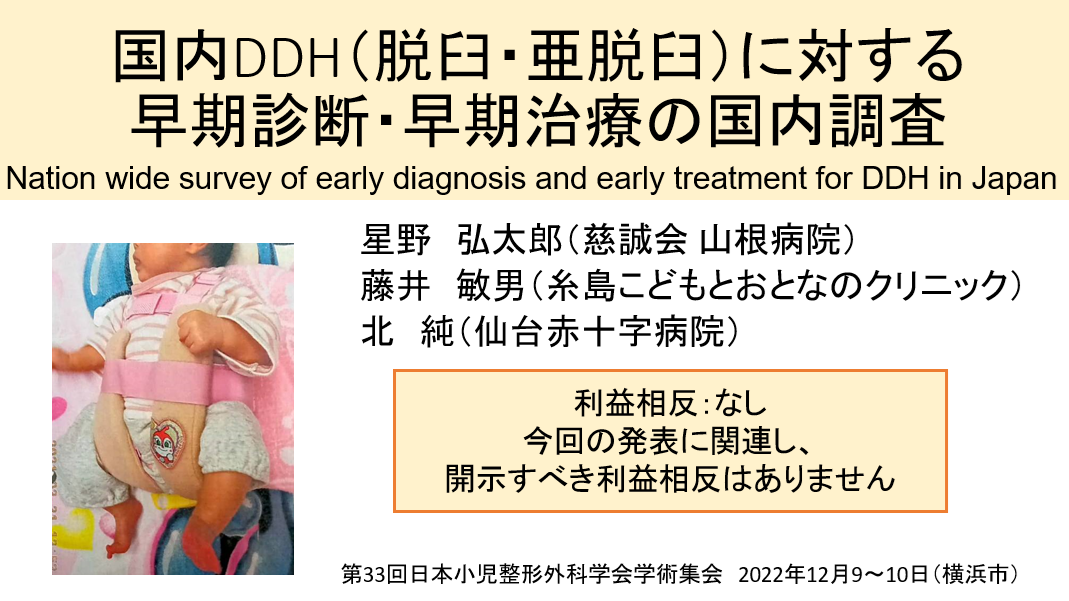 | 2023/6/23発表(千葉県) 第62回日本小児股関節研究会が千葉で開催され、パネルディスカッション 2「DDHに対する装具治療―適応時期と適応条件ー」において「国内DDH(脱臼・亜脱臼)に対する早期診断・早期治療の国内調査(第2報)」を発表させていただきました。日本では股関節脱臼の治療は生後3か月以降が推奨されており、早期治療は少数派でした。世界では生後6週までの早期治療が主流となってきております。国内実態調査の結果、世界の流れを察知され、早期治療に取り組まれている小児整形外科専門ドクターが46%も存在していました。その妥当性は、その治療成績を見ないと証明できませんが、ドイツは早期治療体制導入により、入院・手術・骨盤補正手術が半分以下になった成績があります。国内では福岡こども病院が独自のポリシーで一貫して早期治療をされ、とくに有害性はないと報告されています。それならば生後3か月まで待機する理由はないことになります。今後重要な検討課題となります。 |