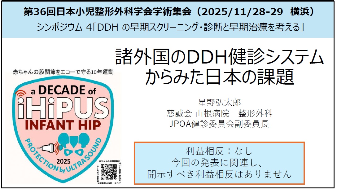 | 2025/11/29発表(神奈川県) 第36回日本小児整形外科学会学術集会におけるシンポジウム4「DDH の早期スクリーニング・診断と早期治療を考える」の中で、ご指名いただき「諸外国のDDH健診システムからみた日本の課題」を発表させていただきました。これから全国的に1か月児健診でも股関節をチェックして整形外科へ紹介するシステムになってゆきます。そのため、今年1年は新しい健診体制について議論して、今後の道筋を明らかにするシンポジウムが多く企画されました。2014年からレビューしてきましたDDH(発育性股関節形成不全)の世界の健診体制も参考とするために数多くご指名いただき、今年7回もの発表の機会をいただき感謝多き1年でした。 これから日本も赤ちゃんの股関節脱臼は、エコーを標準検査としなければなりません。表紙にもマークを掲載しましたが、「iHiPUS(愛ヒップス)」を日本関節病学会・日本股関節研究会・日本整形外科超音波学会・日本股関節学会に続いて5回目の提唱を行ってまいりました。「infant Hip Protection by Ultrasound」の略で、「赤ちゃんの股関節をエコーで守る10年運動」です。応援してください。 |