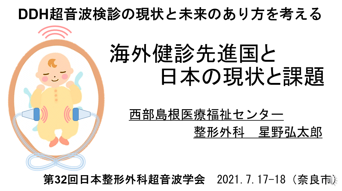 2021/7/17発表(奈良県) 第32回日本整形外科超音波学会が2021/7/17-18に奈良市で開催され、パネルディスカッション「DDH超音波健診の現状と未来を考える」にて、「海外健診先進国と日本の現状と課題」を発表させていただきました。全例超音波スクリーニング(生まれた赤ちゃん全員にもれなく股関節超音波健診を行う)は脱臼遅診断ゼロを実現する唯一の方法と現在考えられています。英国は遅診断ゼロのために、長年培ってきた健診システムを否定し、全例超音波スクリーニングを検討すると宣言しました。日本はまずGraf法を標準的に行える環境・教育を整える必要があることを提案させていただきました。 |
