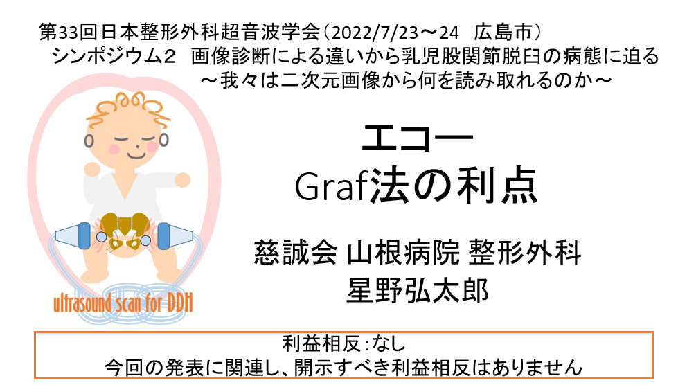| 2022/7/23発表(広島県) 第33回日本整形外科超音波学会が広島市で2022/7/23-24開催され、シンポジウム2「画像診断による違いから乳児股関節脱臼の病態に迫る~我々は二次元画像から何を読み取れるのか~」にご指名いただき、「エコー Graf法の利点」を発表させていただきました。Graf法は静止画像だけからの判別と思われている方も多いと思いますが、実は1993年の教科書ですでに動的観察も組み合わせており、ストレステストにより、さらに詳細に分類されております。とくにGraf分類タイプIIcの骨頭を圧迫してタイプDになるものは不安定IIcであり、装具治療を必要とすると記載されております。乳児股関節エコーセミナーではなかなかそこまで教える時間がとれていないのですが、重要なポイントなので今回強調させていただきました。よりよい治療のためにぜひご記憶ください。 |
