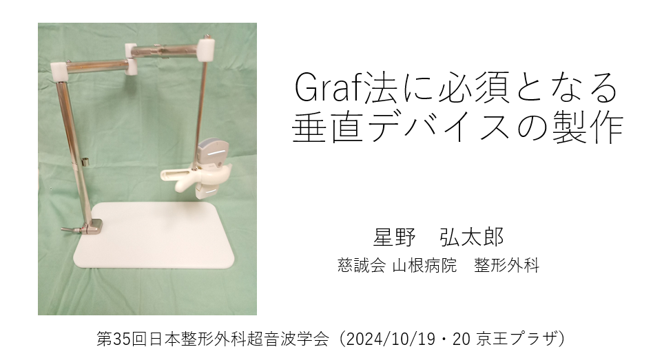 | 2024/10/20発表(東京都) 第35回日本整形外科超音波学会が京王プラザで開催され、主題5下肢疾患において「Graf法に必須となる垂直デバイスの製作」を発表させていただきました。赤ちゃんの股関節脱臼においては、なにより超音波検査が重要です。その世界標準となったGraf法において、正確性を保つためにプローブガイドが必要になっていることを発表させていただきました。 |