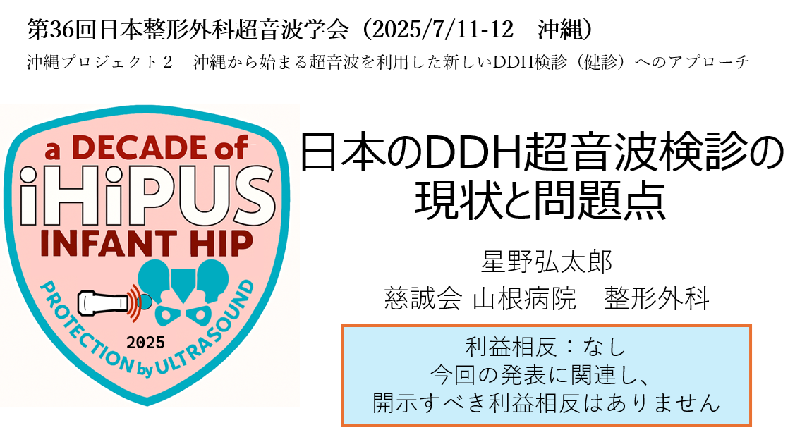 | 2025/7/12発表(沖縄県) 第36回日本整形外科超音波学会におけるシンポジウム「沖縄プロジェクト2 沖縄から始まる超音波を利用した新しいDDH検診(健診)へのアプローチ」の中で、ご指名いただき「日本のDDH超音波検診の現状と問題点」を発表させていただきました。2014年からDDH(発育性股関節形成不全)の健診体制の世界をレビューしてまいりました。健診の再構築も2014年を元年として10年がすぎました。残す日本の課題は超音波を標準検査とすることです。 これから赤ちゃんの股関節脱臼は、必ずエコーで診断することを原則とするように変化しなければなりません。表紙にもマークを掲載しましたが、「iHiPUS(愛ヒップス)」を先週の日本関節病学会に続いて提唱してまいりました。「infant Hip Protection by Ultrasound」の略で、「赤ちゃんの股関節をエコーで守る10年運動」です。その一環ともなる保健師さんの新生児訪問時に保健師さんが赤ちゃんにエコーをあてて検査する沖縄トライアルとの発表になります。 |