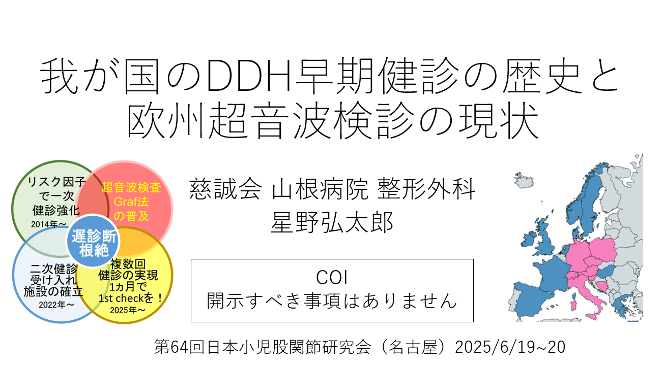 | 2025/6/19発表(愛知県) 第64回日本小児股関節研究会における主題1「1か月健診は股脱新時代へのブレークスルーとなりうるのか?」の中で、「我が国のDDH早期健診の歴史と欧州超音波検診の現状」を発表させていただきました。本会は子どもの股関節疾患について最も熱く議論できる会です。赤ちゃんの股関節チェックがこれまでの4か月児だけでなく、1か月児でもなされ、ダブルチェックが実現しようとしています。そこで重要になるのが超音波診断です。その重要性を解説させていただきました。生まれた赤ちゃん全員に股関節エコーができるのはいつの日か⁉ |