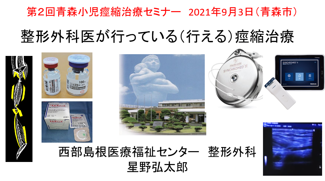 2021/9/3講演(Web開催) 第2回青森小児痙縮治療セミナーが2021/9/3に第一三共株式会社の協賛でWeb開催され、「整形外科医が行ってきた(行える)痙縮治療」をオンライン講演させていただきました。重症心身障害者の方々の苦悩を思うと、自分に何ができるのか、考えさせられ、無力感を感じざるを得ません。その中でもできること、一つ一つ積み重ねてきた結果を発表させていただきました。PDFのスライドでは動画は見れませんので、異常な動きやその改善は分かりにくいと思いますが、ご容赦ください。 |
