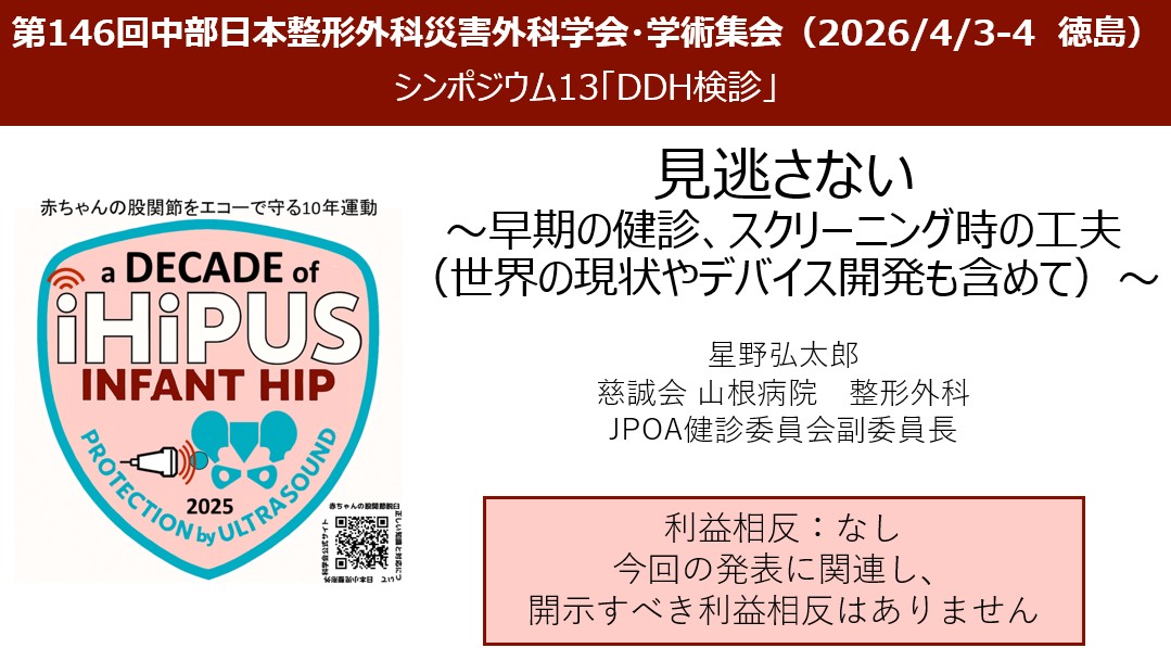 | 2026/4/4発表(徳島県) 第146回中部日本整形外科災害外科学会学術集会におけるシンポジウム13「DDH検診」の中で、ご指名いただき「見逃さない~早期の健診、スクリーニング時の工夫(世界の現状やデバイス開発も含めて)~」のタイトルで発表させていただきました。登壇されたメンバーは、奈良医大米田先生、滋賀こども下薗先生、鳥取大学榎田信平先生、岡山旭川荘青木清先生。早期診断のトップランナーのみなさんで、日本の健診の問題点も今後どうしたらよいかも意見は同じでした。全例エコー検診でなければ、遅診断はゼロにできない!という意見でまとまりました。現実的には道は険しいのですが、どんなに険しくても理想とするものが見えたなら、まずはそれを宣言をする必要があります。そうした意味では大きな一歩となったシンポジウムになったと思い、感慨深かったですね~。 |
