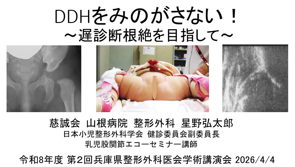 | 2026/4/4発表(兵庫県) 令和8年度第2回兵庫県整形外科医会学術講演会にて「DDHをみのがさない!遅診断根絶をめざして」のタイトルで発表させていただきました。半年以上前から薩摩眞一先生にお声をかけていただき準備をさせていただきました。薩摩先生(当時兵庫こども病院)は私が小児整形外科の世界に入ったとき、日本股関節研究会を主管され、参加した私に、「わからないことがあったら何でもきいてくれていいよ、みんな仲間だから」と言ってくださった恩人です。そして小林大介先生(兵庫こども病院部長)は鳥取大学の先輩でもあり、学会で会うたびに声をかけてくださり、さらには特発性寛骨臼形成不全についての研究から、私に大きなアドバイスをしてくださり、日本股関節学会最優秀論文賞につながるのでした。島根でなんとか独りでもやってこれたのも、お二人をはじめ多くの先生に支えられてでしたが、そんなお二人の先生に少しでも恩返しができて本当にうれしかったです。JCOAのみなさまにも大変盛り上げていただき、兵庫での乳児股関節エコーセミナー開催につながるとうれしいですね。 |
