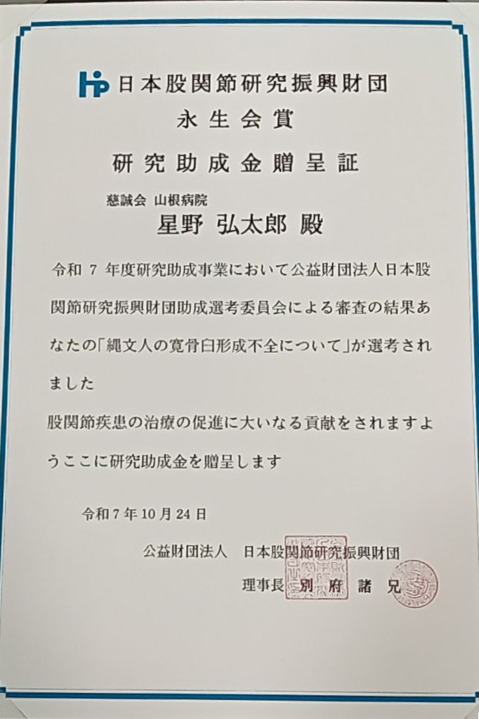 | 2025/10/25日本股関節研究振興財団 研究助成交付式(山口県) 令和7年度股関節研究セミナー内におきまして、研究助成金の交付式が行われました。かねてから縄文人の研究のための資金捻出が困難でクラウドファンディングも行ったのですが、十分には集まらず困っていたところでした。多くの研究助成には年齢制限や大学に限られるような所属制限があり、私の立場ではなかなか難しい状況でしたが、本研究助成はそういった縛りがなくたいへんありがたいことでした。審査員には小児股関節の形態計測に関する素晴らしい論文を書かれた泉田良一先生もおられ、私の研究の発想をとてもほめてくださり、たいへんうれしかったです。 |