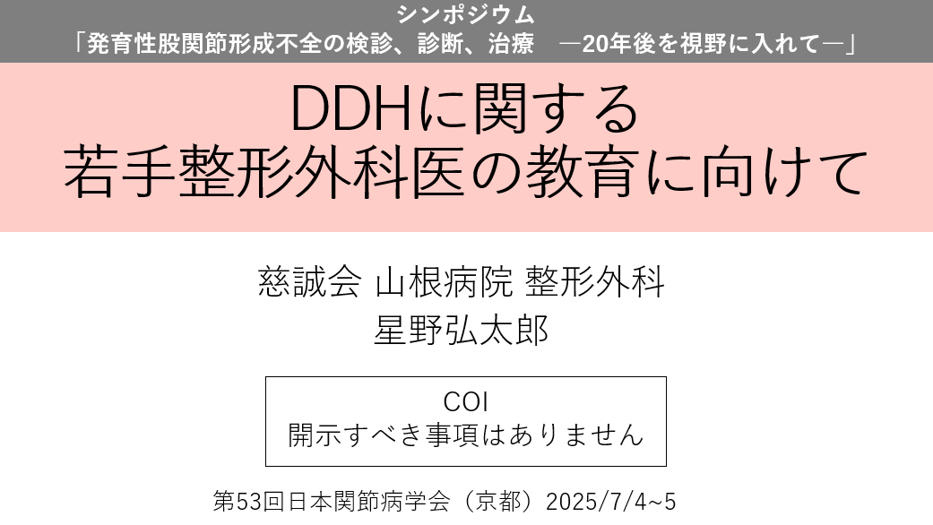 | 2025/7/5発表(京都府) 第53回日本関節病学会におけるシンポジウム「発育性股関節形成不全の検診、診断、治療 ―20年後を視野に入れて―」の中で、「DDHに関する若手整形外科医の教育に向けて」を発表させていただきました。とても大きなテーマで方向性に悩みましたが、DDHの将来はエコーにかかっていることから、乳児股関節エコーセミナーの重要性と詳細な内容紹介を主旨としました。これから赤ちゃんの股関節脱臼は、必ずエコーで診断することを原則とするように変化しなければなりません。せっかく病院にかかっても、わかりにくいX線検査のみで見逃された赤ちゃんもいます。エコーで大丈夫なら脱臼はない(偽陰性ゼロ)、この超音波診断が周知徹底することが大切な時代に入ってきました。日本で初めて「赤ちゃんの股関節をエコーで守る運動」を提唱させていただきました。その名も「iHiPUS(愛ヒップス)」運動です。そのためにはエコー習得者がもっともっと増えてほしい。成人股関節専門の先生にも、ぜひ赤ちゃんの股関節脱臼の診断スキルをもっていただきたいという、お願いをさせていただきました。 |