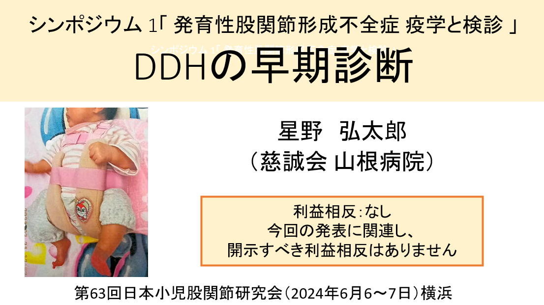 ![]() 論文→雑誌「整形外科」75:1237-1244,2024. | 2024/6/6発表(神奈川県) 第63回日本小児股関節研究会が横浜で開催され、シンポジウム 1「発育性股関節形成不全症 疫学と検診」 において「DDHの早期診断」を発表させていただきました。赤ちゃんの股関節脱臼においては、世界的には生後6週までに治療をはじめることが標準化してきています。日本では3-4か月児健診のみの一回勝負で股関節脱臼をチェックすることが長年慣習化されていました。脱臼の診断遅延例をなくすためには、より早期の診断機会を作る必要があります。こども家庭庁から2023年末に、なんと1か月児健診でも股関節脱臼のチェックをするように改善されることが指示されました!これはすごいことで、周知いただけるよう報告させていただきました。 |