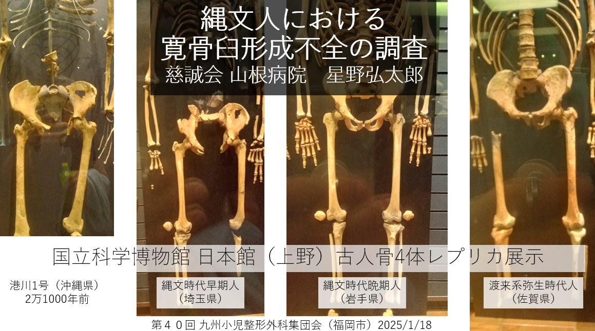| 2025/1/18講演(福岡県) 第40回九州小児整形外科集団会が福岡市西新プラザで開催され、縄文人についての研究をはじめて発表いたしました。なぜ「寛骨臼形成不全」が日本人に有病率13%と圧倒的に多いのか(海外では1~5%)。大きな謎に挑んだ世界初の研究です。国立科学博物館の篠田謙一館長と縁あって共同研究させていただくことになり実現しました。結果、現代人13%よりも縄文人の方がより高い有病率33%を示し、寛骨臼形成不全が縄文ゲノムの影響ではないかという仮説の要件を満たしていました。素人考えの発想で自信がなかったのですが、発表の後、多くの参加ドクターに反響をいただき、勇気と自信を持たせていただきました。整形外科で最も大きい学会、日本整形外科学会で5月に発表できることになりました。 |