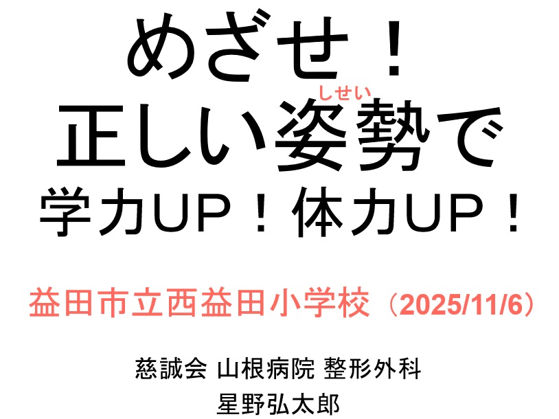 | 2025/11/6講演(島根県益田市) 益田市立西益田小学校にて、5・6年生47人に向けて、子どもたちの体を守るテーマで講演させていただきました。6月にすぐ近くの横田中学校で講演させていただき、そのすぐ後にお話をいただきました。どんどん広がってくれてうれしいです。本テーマでの講演は、2017年から28回目になります。よい姿勢のための4つの体操、子どもの体と整形外科の病気について、ドクターのなり方、夢をもって勉強してもらうための知識などお話ししました。とっても盛り上がって楽しかったですね!一所懸命聞いてくれてありがとうございました! |