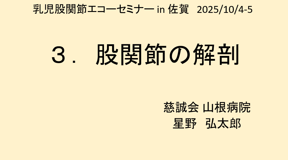 | 2024/1/27講演(岡山県) 第87回乳児股関節エコーセミナーが岡山で1月27-28日に岡山大学整形 鉄永智紀会長のもと開催され、講師として参加いたしました。私はセミナー概要、超音波の基礎、股関節の解剖について講演いたしました。 |