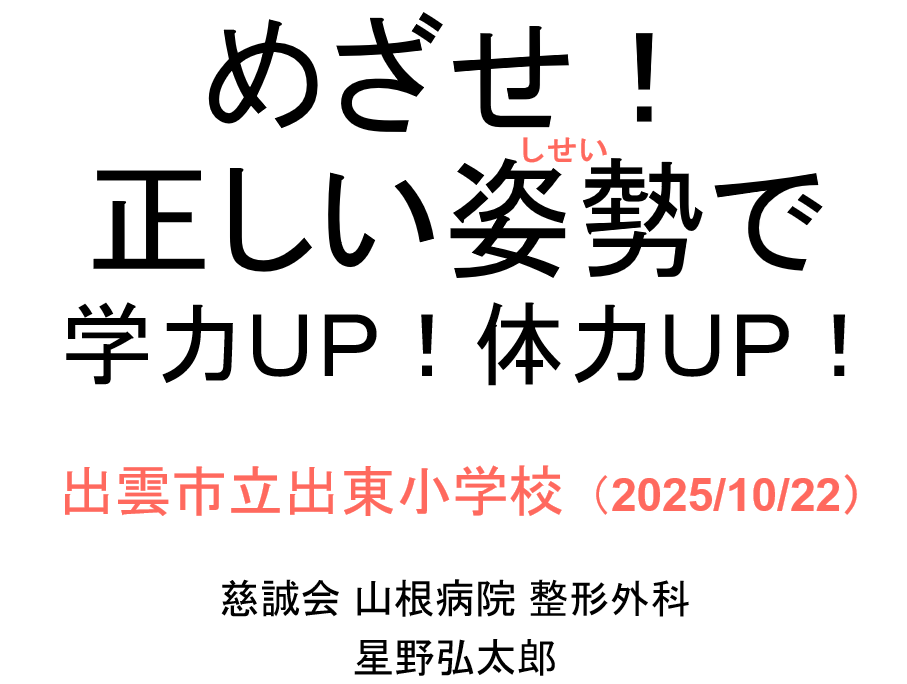 | 2025/10/22講演(島根県出雲市) 出雲市立出東小学校にて、5・6年生64人に向けて、子どもたちの体を守るテーマで講演させていただきました。本テーマでの講演は、2017年から26回目になりますが、島根県内の東部でははじめてでした!昨年8月の養護教諭の研修会で聴いてくださった先生からのご依頼でした。よい姿勢のための4つの体操、子どもの体と整形外科の病気について、ドクターのなり方、夢をもって勉強してもらうための知識などお話ししました。今回も知識の成長をゲットしたポイントで、大きな拍手が沸き、たいへん盛り上がりました!保護者の参加数も大変多くうれしかったです。一所懸命聞いてくれてありがとうございました! |