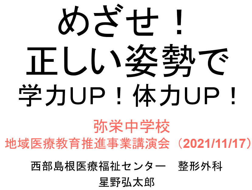 | 2021/11/17講演(島根県浜田市) 浜田市立浜田第二中学校に、昨年に続き2度目の訪問させていただきました。全校生徒42名に向けて、子どもたちの正しい姿勢をテーマに講演させていただきました。本テーマでの講演は、2017年から15回目になります。毎回バージョンアップして、よい姿勢のための4つの体操、勉強に大切な“勉強体力”、なぜ勉強しないといけないのか、ドクターにどうやってなったのか、など楽しくお話しさせていただきました。 |