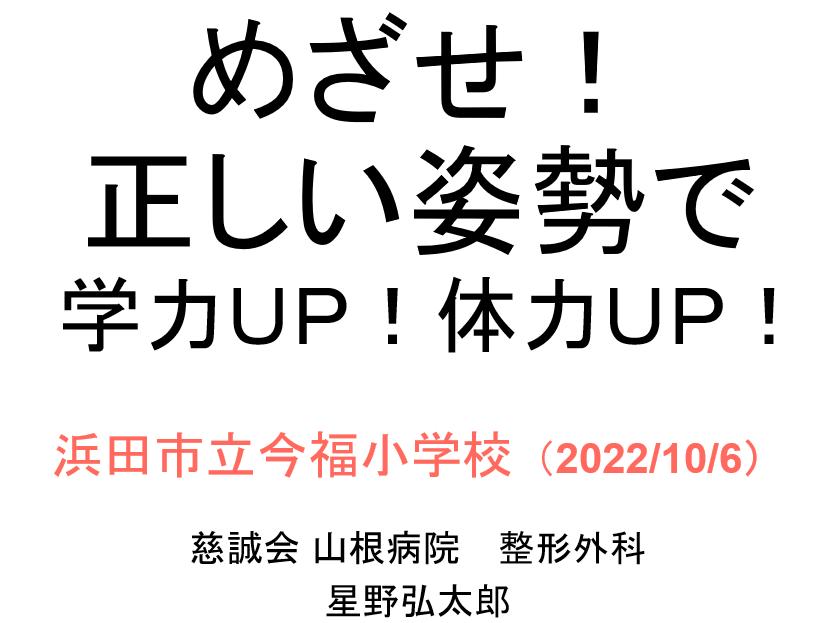| 2022/10/6講演(島根県浜田市) 浜田市立今福小学校にて、3~6年生26名に向けて、子どもたちの正しい姿勢をテーマに講演させていただきました。本テーマでの講演は、2017年から17回目になります。毎回バージョンアップして、よい姿勢のための4つの体操、勉強に大切な“勉強体力”、なぜ勉強しないといけないのか、ドクターにどうやってなったのか、など楽しくお話しさせていただきました。 |