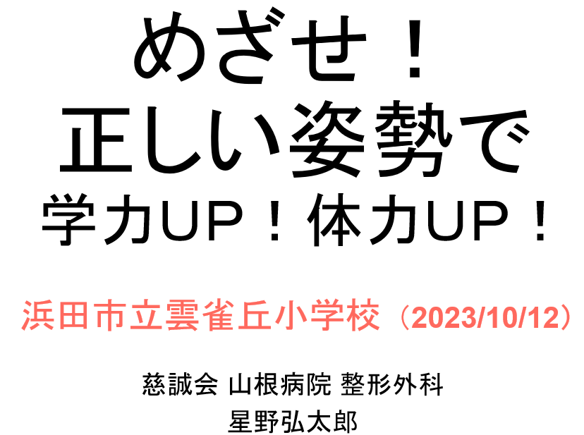 | 2023/10/12講演(島根県浜田市) 浜田市立雲雀丘小学校にて、全校生徒57名、保護者に向けて子どもたちの正しい姿勢をテーマに講演させていただきました。本テーマでの講演は、2017年から18回目になります。本校には2020年にも同じテーマで講演させていただき、今回で2回目です。今年度で統廃合されるそうで、最後にとこの機会をいただいた有田先生に感謝いたします。 |