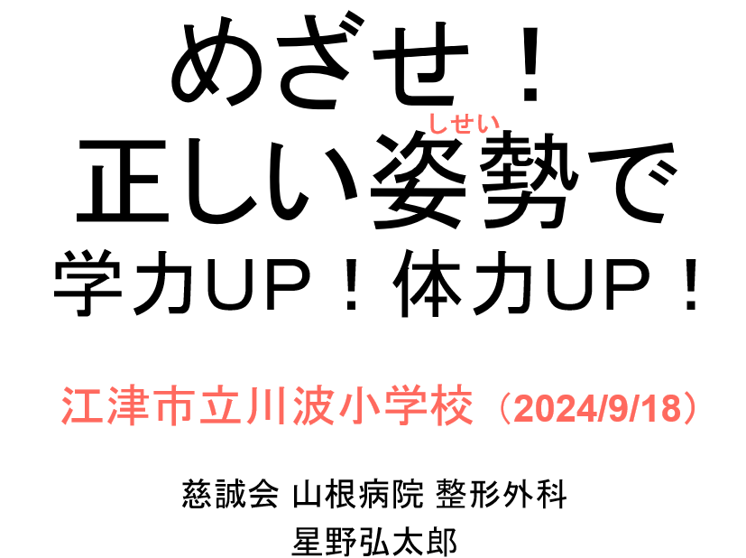 | 2024/9/18講演(島根県江津市) 江津市立川波小学校にて、全校生徒86名、保護者に向けて、子どもたちの正しい姿勢をテーマに講演させていただきました。本テーマでの講演は、2017年から21回目になります。今までで一番多い生徒数でしたが、先生方のご協力のおかげで楽しくできました。 |