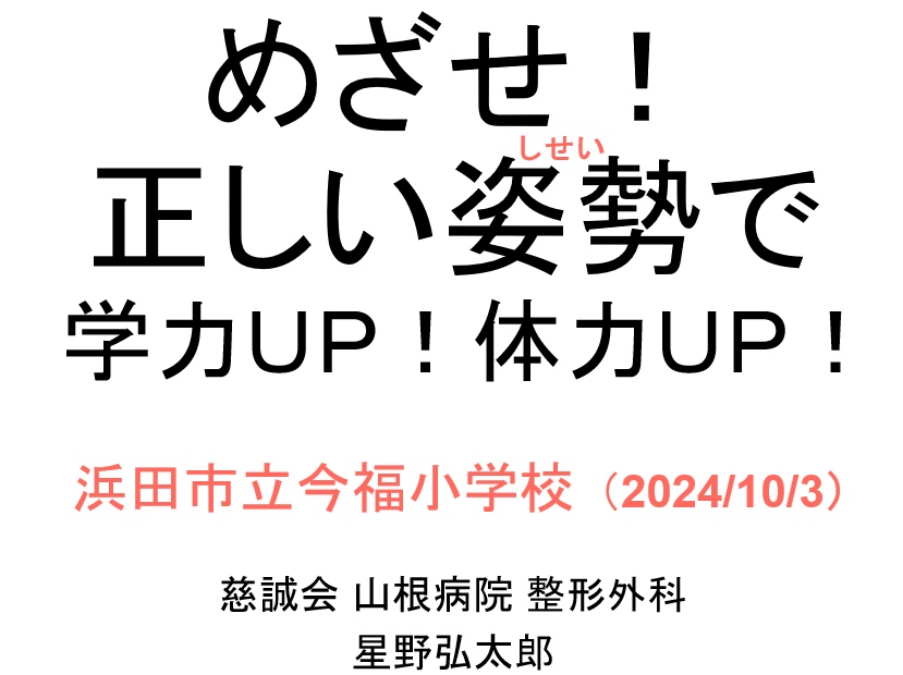 | 2024/10/3講演(島根県浜田市) 浜田市立今福小学校にて、3~6年生23名に向けて、子どもたちの正しい姿勢をテーマに講演させていただきました。本テーマでの講演は、2017年から23回目で、本校は2回目の訪問になります。毎回バージョンアップして、よい姿勢のための4つの体操、子どもの体と整形外科の病気について、ドクターのなり方、夢をもって勉強してもらうための知識など楽しくお話しさせていただきました。生徒のみなさん、目をキラキラさせて一生懸命聞いてくれてうれしかったです。アンケートにて「楽しらないことがわかってよかった」が20人でした! |