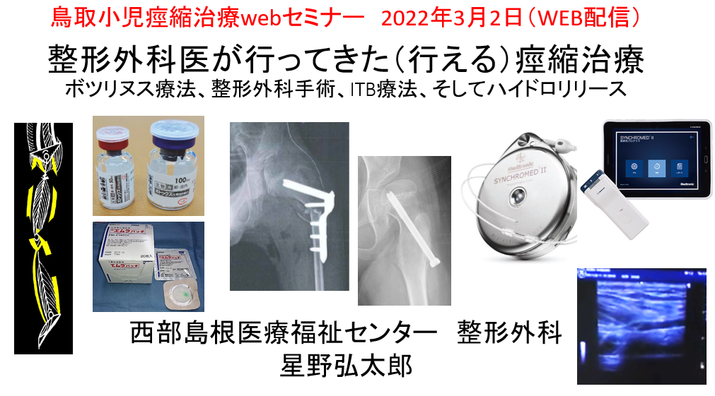 2022/3/2講演(Web開催) 鳥取痙縮治療webセミナーが2022/3/2に第一三共株式会社の協賛でWeb開催され、「整形外科医が行ってきた(行える)痙縮治療 ボツリヌス療法、整形外科手術、ITB療法、そしてハイドロリリース」をオンライン講演させていただきました。重症心身障害者の方々の苦悩を思うと、自分に何ができるのか、考えさせられ、無力感を感じざるを得ません。その中でもできること、一つ一つ積み重ねてきた結果を発表させていただきました。PDFのスライドでは動画は見れませんので、異常な動きやその改善は分かりにくいと思いますが、ご容赦ください。 |
