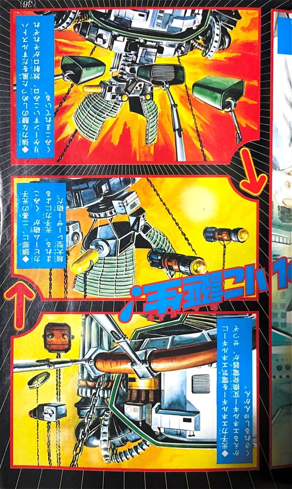 特 集 4色5p マジンガーZ大図解特集 ドクター=ヘルの2大要塞大公開!(表紙1p) 大進撃!新海底要塞ブード!(2p) 悪魔の飛行要 グールのひみつ 大図解(2p) 構成/ダイナミックプロ,絵/関口猪一郎 |