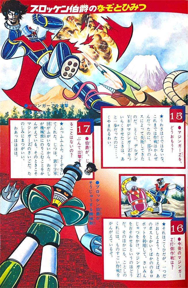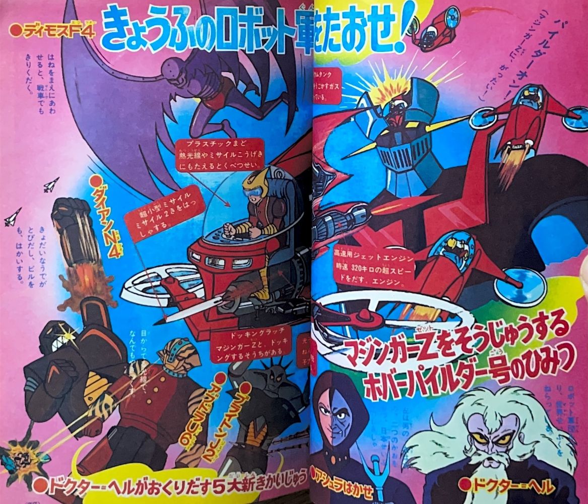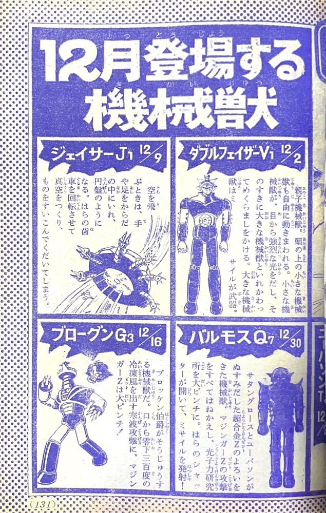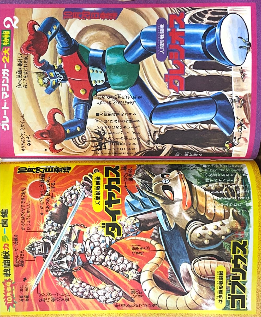 特 集マジンガーZ 95機械獣総登場! 特 集マジンガーZ ピグマン子爵の正体とは!? 特 集ゲッターロボの敵 恐竜帝国をあばく! マンガ「ゲッターロボ」蛭田充 マンガ「マジンガーZ」天保革 扉4色 |