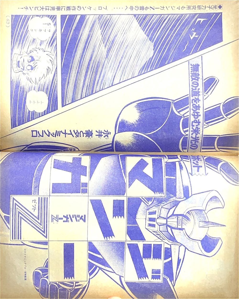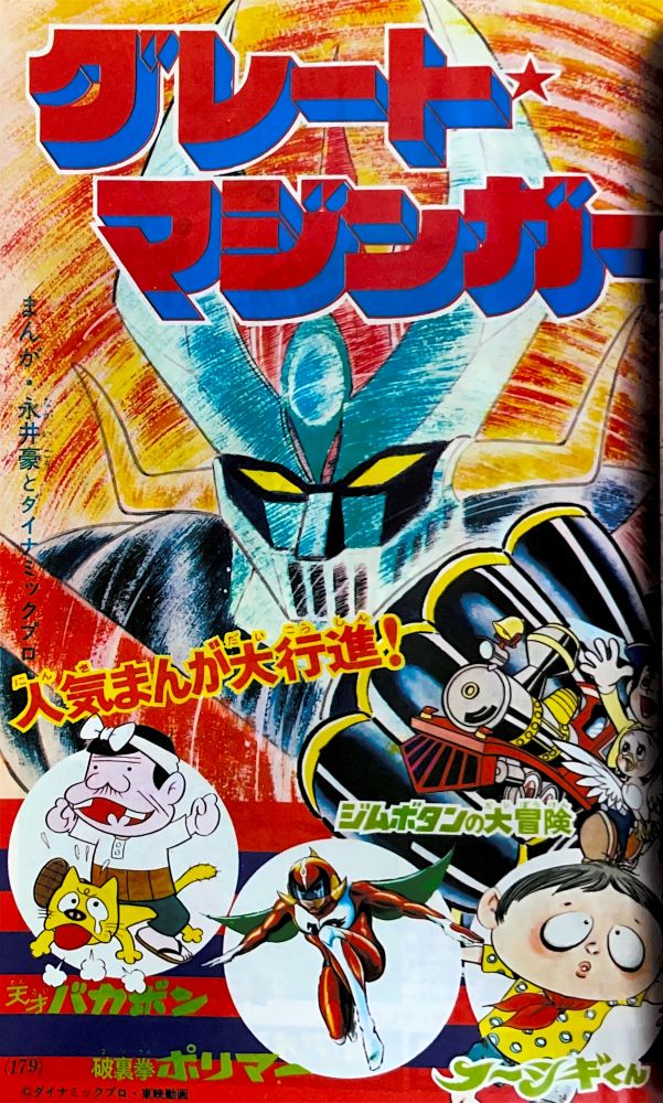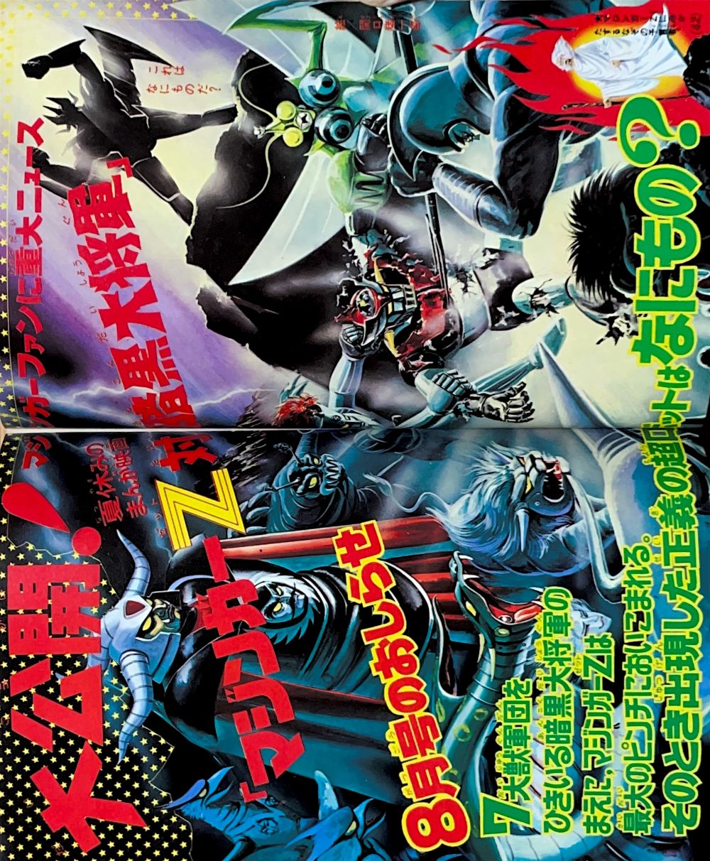 カラー特集 マジンガーZ・暗黒大将軍とはいったい何者か? 新登場!!グレートマジンガー これがゲッターロボの操縦法だ!! マンガ「マジンガーZ」天保革 扉4色 マンガ「ゲッターロボ」蛭田充 |