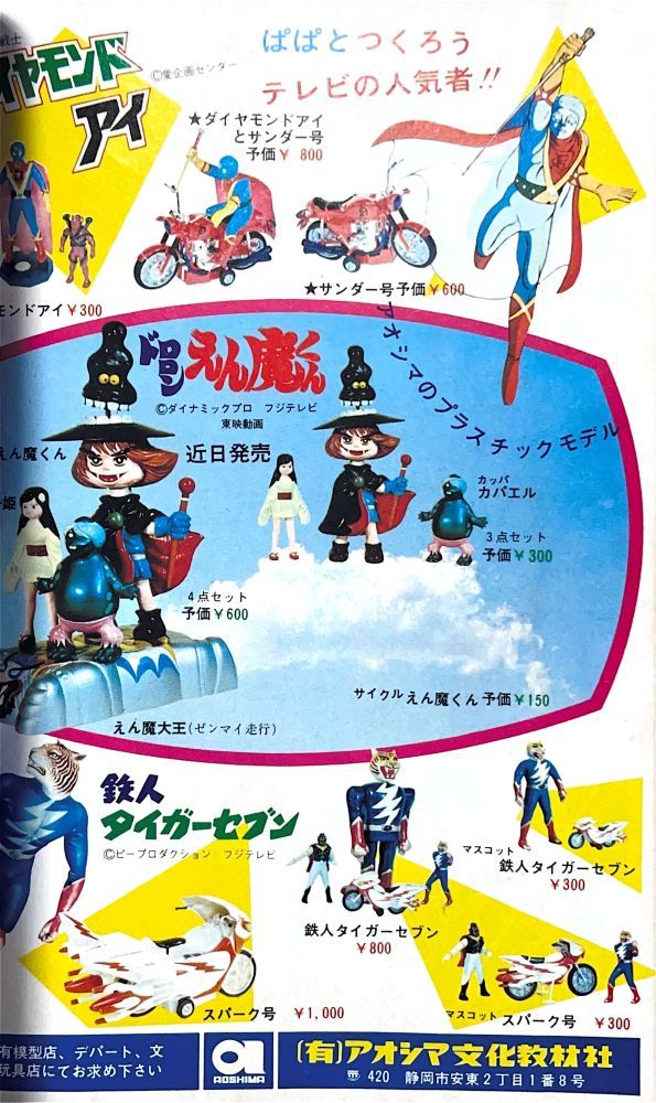 巻頭付録「ゴーゴン大公スタンド」欠 特 集「マジンガーZショッキング特報 あしゅら男爵が死んだ!」グラビア+4色6p マンガ「マジンガーZ」15p/ケンタウドールγ7 記 事「マジンガーズクラブ」8p/機械獣名まえ募集!ほか 広 告 ポピー「ジャンボマシンダー」「ポピニカ」 広 告 パトラ「ハンドライト」「ソフトペンダント」 広 告 アオシマ文化教材社「ドロロンえん魔くんなど」 |