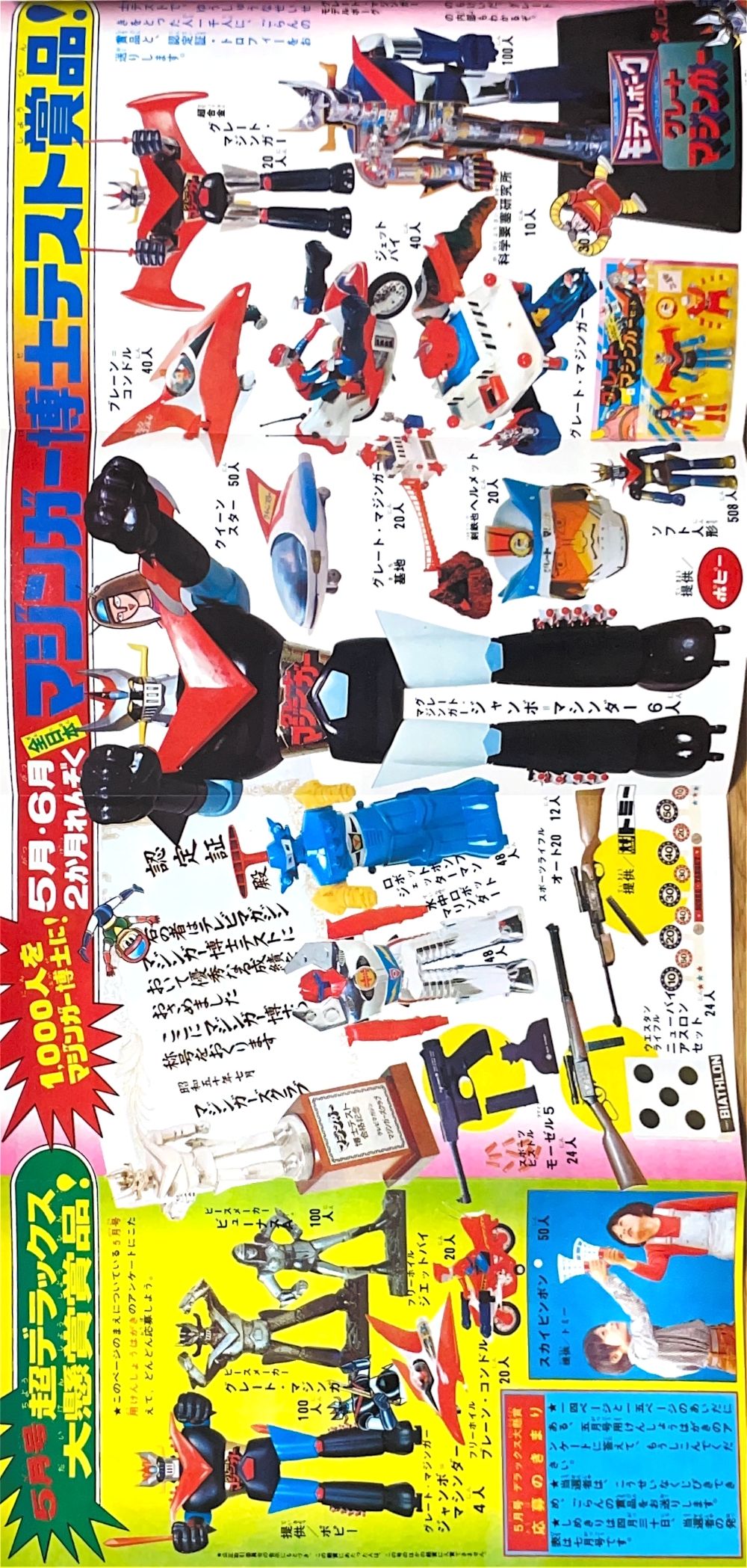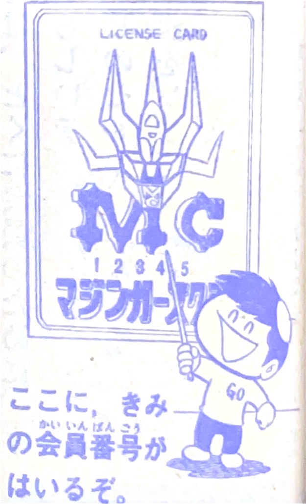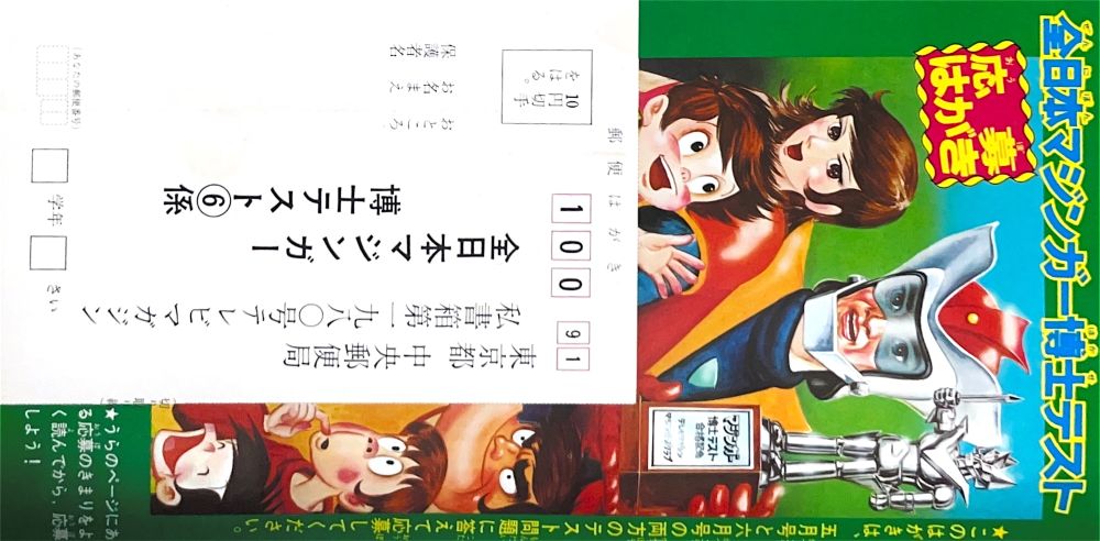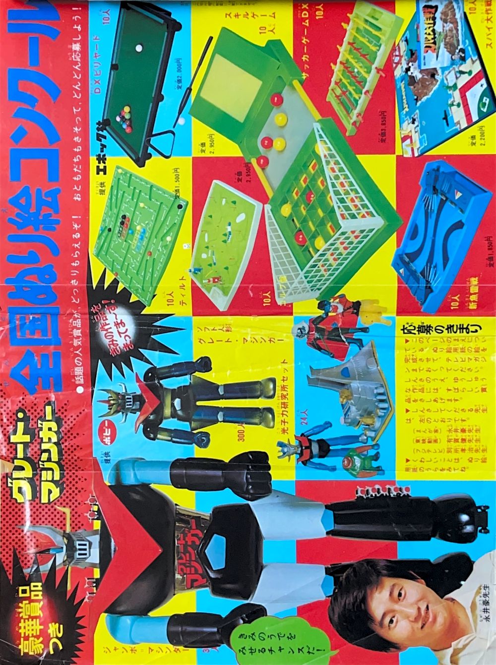 懸 賞「マジンガーZ新連載記念とくべつ懸賞」 永井先生色紙3人、ジャンボマシンダー7人、 ヘルメット20人、フリクションパイルダー号30人、 ダイカスト人形マジンガーZ50人 ソフト人形マジンガーZ100人 |