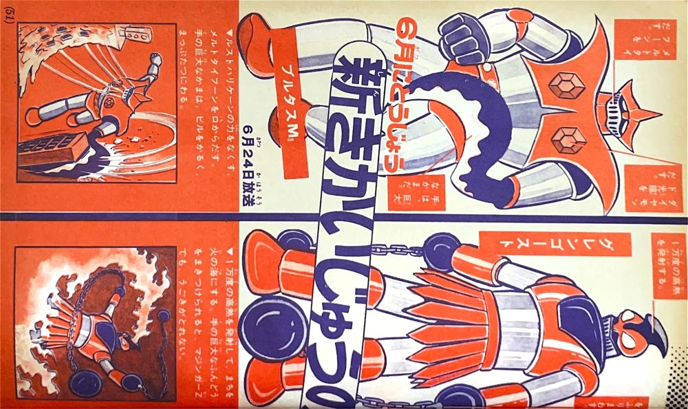 巻頭付録「グレート・マジンガー名場面アルバム」 巻頭付録「全国ぬり絵コンクール用紙」 特 集「グレート・マジンガーひみつ大特集」4色10p 記 事「マジンガーズクラブ」グレート・マジンガー誕生のひみつ大特集13p マンガ「偉大な勇者 グレート★マジンガー」新連載 18p(扉4色)/グラトニオスとビラニアス |