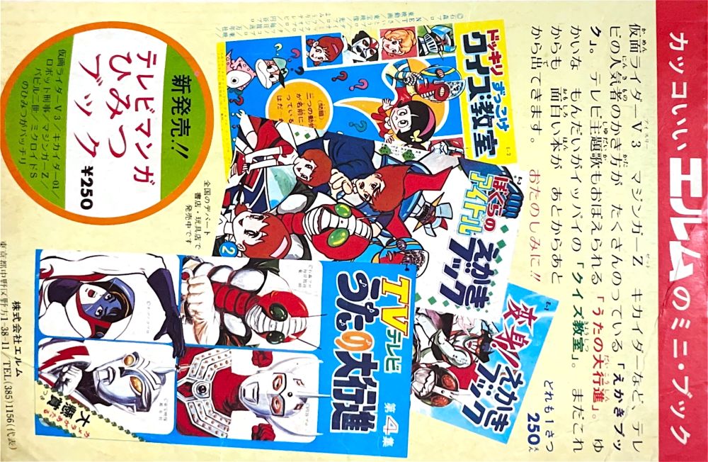 特集「マジンガーZの大空中戦」は一部欠 特集「飛行要塞ナバローン」4色2p 懸賞「マジンガーZワイド大けんしょう」4色2p 広告 エルム「エルムのミニブック」(表紙裏) |
