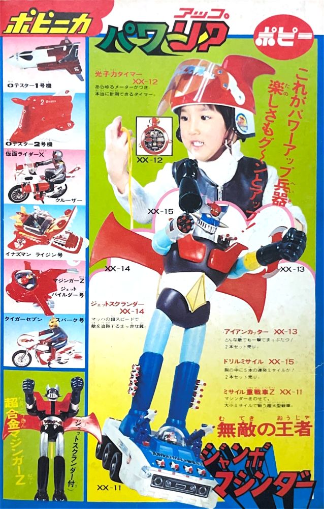 次号予告 新年もうれつ特大号 4色2p+白黒2p 広告 パトラ・ポピー「ハンドライト」宣伝ページが仮面ライダーV3からマジンガーZへ交代! 広告 タカラ「変身サイボーグ」数々のラインナップ勢ぞろいの一番端にマジンガーZ登場! |
