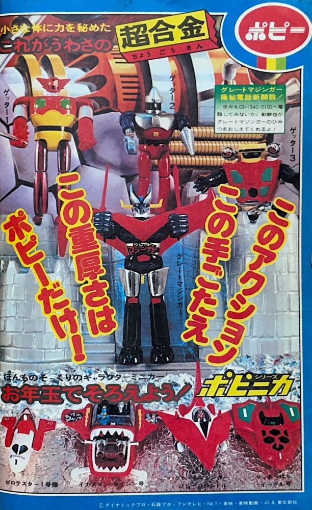 巻頭付録「甲児とさやかからの手紙」4色1p 巻頭付録「グレート・ゲッターカラー図解カード」4色4p グラビア「グレート・ゲッター記念アルバム」4色,「グレート・ゲッター体力・能力くらべ」2色 懸 賞 ポピー「超合金クイズ大会」4色8p 特 集「グレート・マジンガーのひみつ大百科」4色15p(南村喬之,関口猪一郎,小林壇) 特 集「全戦闘獣ひみつものしり百科」(成井紀郎)31p単色 記 事「きみはグレート派か?ゲッター派か?」(企画・構成/菊地忠昭)変形16p単色 マンガ「グレート・マジンガー対ゲッターロボ」(桜多吾作)94p(扉4色)/宇宙金属獣ギルギルガン登場! 広 告 バンダイ「グレート・マジンガー モデルボーグ」4色1p 広 告ポピー「超合金」「ポピニカシリーズ」裏表紙 |
