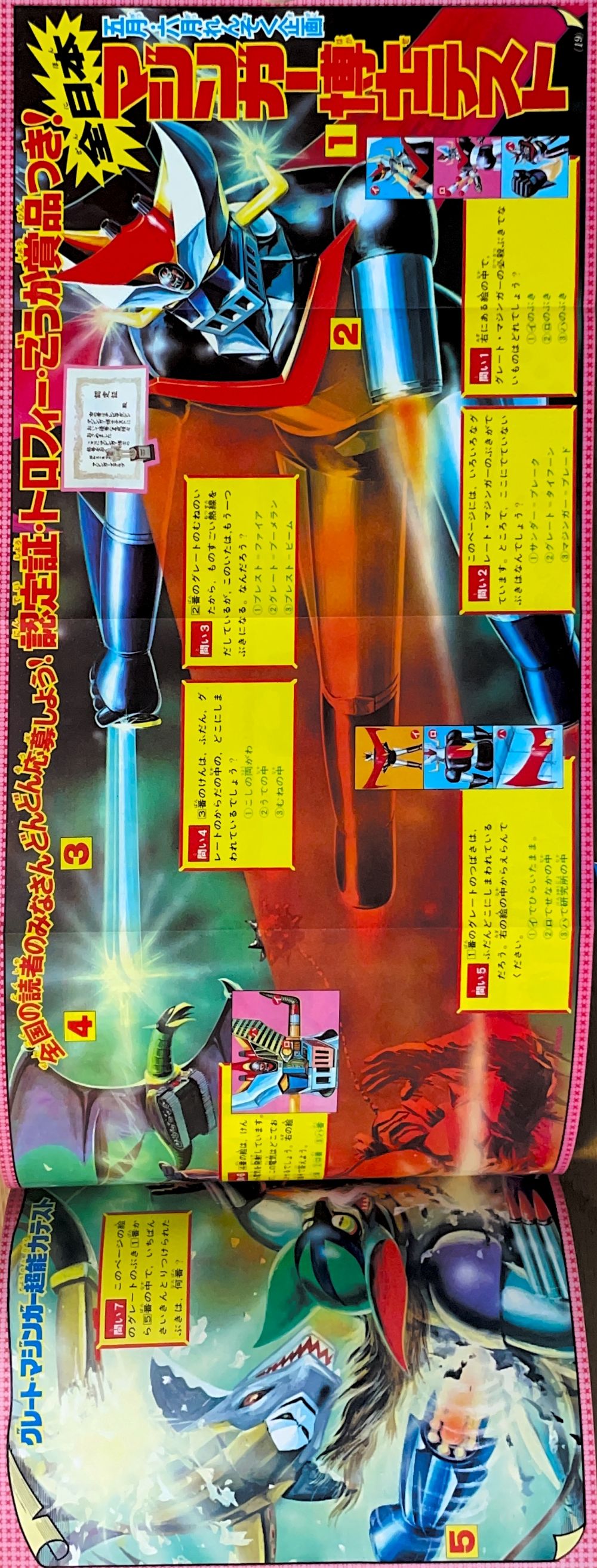 巻頭付録「グレート・マジンガー新戦闘獣ものしりカード」変形4色4p ダンザニア,グラシス,ハーピイ,ダンドール,ドルマン,ゴーリキ グラビア「全日本マジンガー博士テスト」4色7p 1000人にトロフィーと認定証を!