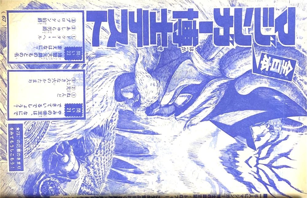 ピンナップ「やった!3大パワー正義の力」 特 集「東映まんがまつり特報 史上最大の決戦」24p 特 集 4色7p(岡崎甫雄1p,渡辺正美4p,生頼範義2p) 特 集 2色8p(大村光正1p,岡崎甫雄2p,根本アートセンター2p,渡辺正美1p) 特 集 1色9p(渡辺正美1p,大村光正4p,生頼範義2p,岡崎甫雄2p) マンガ 大決戦!!大海獣(三森あきら)33p扉4色 |