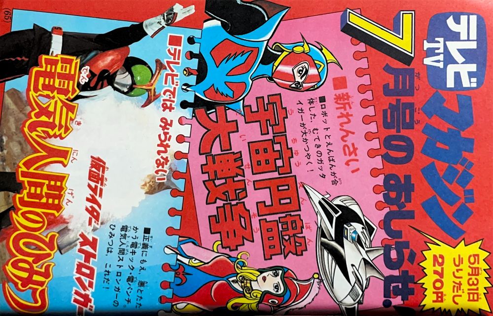 カラー特集 さようなら仮面ライダー 激戦のあと総まとめ 鋼鉄ジーグ ヒミカがねらう銅鐸とは? ゲッターロボG 決戦にそなえ大特訓 グレンダイザー ベガ星基地ひみつ情報 | マンガ 「ゲッターロボG」秋本シゲル 「UFOロボグレンダイザー」今道英治 「鋼鉄ジーグ」桜多吾作 |