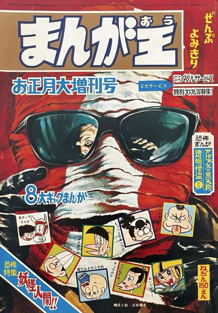 懸賞 サインプレゼント&懸賞問題にも! 告知 まんが王お正月大増刊号「キックちゃん」イラスト2点あり。 イラストから少年ブック1969(昭44)4月号ふろく掲載された「コイビトくん」と同じものと判明! |