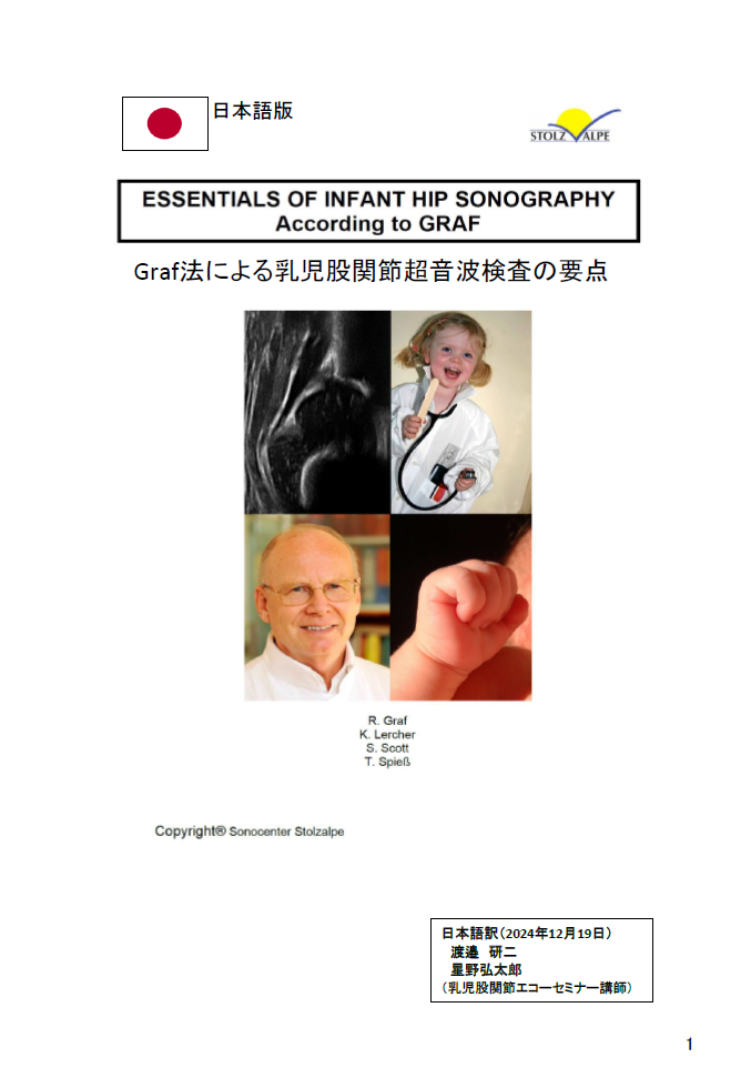 Grafテキスト和訳「ESSENTIALS OF INFANT HIP SONOGRAPHY According to GRAF ~Graf法による乳児股関節超音波検査の要点~」 2024/12/19発行 2017年に発行されたGraf法の日本語版テキストです。これまで 故・渡邉研二先生(亀田第一病院)が日本語訳されていましたが、英語版が2017年にアップデートされていました。新たに追加された部分を私が翻訳し補完したバージョンです。日本整形外科超音波学会 乳児股関節エコーセミナー公認です。セミナーでも配布されますが、セミナーではより分かりやすいテキストが付属し、講義も丁寧なので、これをみても全部が入ってこないかもしれませんが、安心してセミナーにご参加ください。セミナー情報はこちら。英語版はここで公開中。 |