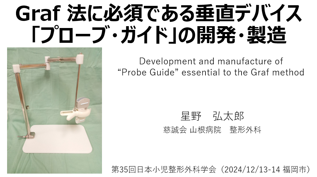 | 2024/12/13発表(福岡県) 第35回日本小児整形外科学会が福岡国際会議場で開催され、一般演題でプローブガイドの研究を発表いたしました。赤ちゃんの股関節脱臼の超音波検査で、正確性を保つためにGraf教授が必ず必要だとおっしゃられているガイドです。日本にないため、まず自作し、それを製品化するために動いております。そのことを発表させていただきました。フリーハンドで慣れているドクターにもぜひ使っていただきたいと思っています。 |