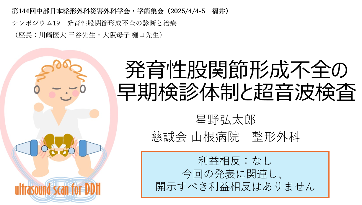| 2025/4/5発表(福井県) 第144回中部日本整形外科災害外科学会・学術集会でのシンポジウム19「発育性股関節形成不全の診断と治療」の中でご指名いただき発表させていただきました。名古屋大学、滋賀県立総合病院、兵庫こども病院、大阪母子医療センターと、名だたる小児整形外科の拠点病院の先生方の中で、緊張しましたが、今の時代のための赤ちゃんの股関節脱臼に対する早期検診体制および超音波検査の必要性をアピールさせていただきました。若い先生がしっかり聞いてくれてうれしかったです。 |