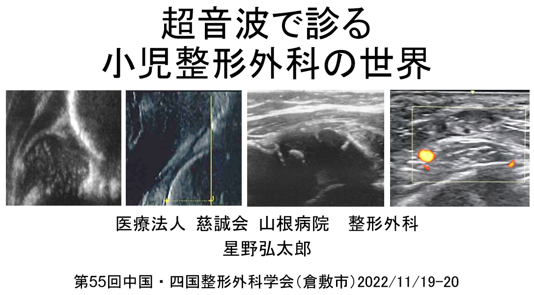 | 2022/11/20教育研修講演(岡山県) 第55回中国・四国整形外科学会が倉敷で2022/11/19-20開催され、会長の三谷茂先生から依頼され、教育研修講演を承りました。タイトルは「超音波で診る小児整形外科の世界」とし、雑誌「関節外科 基礎と臨床 Vol.40 10月増刊号 2021」で『小児整形外科におけるエコーの有用性』として論文にまとめていたDDHの超音波診断ならびに種々の小児整形外科疾患に対するエコーの優れた診断能力を解説しました。参加されている多くの若手ドクターにぜひエコーを身近で素晴らしいものに感じてほしくて、それが伝わるような症例を提示し、麻痺性尖足に対するハイドロリリース(これはのちに雑誌「臨床整形外科 Vol.58 No.3 2023」に『脳原性麻痺における癒着性尖足に対する筋膜ハイドロリリース』として論文化)など新しい試みも提案しました。 |