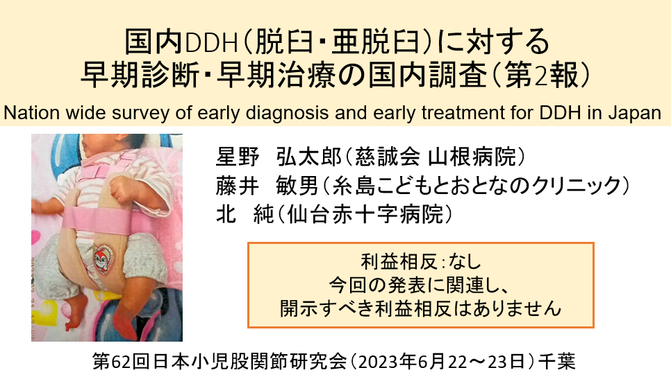 | 2023/6/23発表(千葉県) 第62回日本小児股関節研究会が千葉で開催され、パネルディスカッション 2「DDHに対する装具治療―適応時期と適応条件ー」において「国内DDH(脱臼・亜脱臼)に対する早期診断・早期治療の国内調査(第2報)」を発表させていただきました。日本では股関節脱臼の治療は生後3か月以降が推奨されており、早期治療は少数派でした。世界では生後6週までの早期治療が主流となってきております。国内実態調査の結果、世界の流れを察知され、早期治療に取り組まれている小児整形外科専門ドクターが46%も存在していました。その妥当性は、その治療成績を見ないと証明できませんが、ドイツは早期治療体制導入により、入院・手術・骨盤補正手術が半分以下になった成績があります。国内では福岡こども病院が独自のポリシーで一貫して早期治療をされ、とくに有害性はないと報告されています。それならば生後3か月まで待機する理由はないことになります。今後重要な検討課題となります。 |