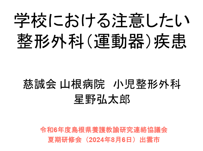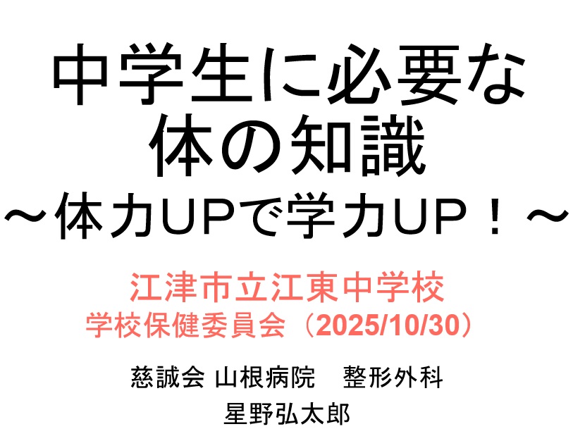 | 2025/10/30講演(島根県江津市) 江津市立江東中学校にて、全校生徒29人に向けて、子どもたちの体を守るテーマで講演させていただきました。本テーマでの講演は、2017年から27回目になります。この講演を始めるきっかけになった養護教諭の泉先生が、あちこち転勤されても私の講演を依頼し続けてくださるおかげで、本当にいろいろな学校でお話しできてうれしいです。よい姿勢のための4つの体操、子どもの体と整形外科の病気について、ドクターのなり方、夢をもって勉強してもらうための知識などお話ししました。一所懸命聞いてくれてありがとうございました! |