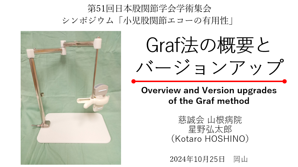 | 2024/10/25発表(岡山県) 第51回日本股関節学会が岡山で開催され、シンポジウム「小児股関節エコーの有用性」にて、会長の三谷茂教授からご指名をいただき発表する機会をいただきました。この学会にはGraf教授も招聘され、特別セミナーが開催されました。赤ちゃんの股関節脱臼においては、なにより超音波検査が重要です。その世界標準がGraf法です。そしてフリーハンドの時代から、正確性を保つためにプローブガイドが必要になっているバージョンアップが日本でも必要です。そのことを発表させていただきました。 |