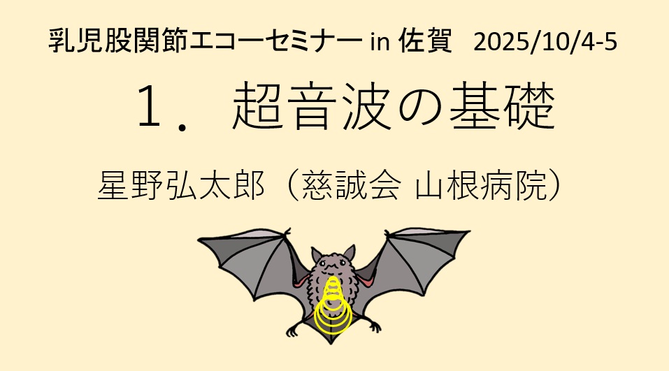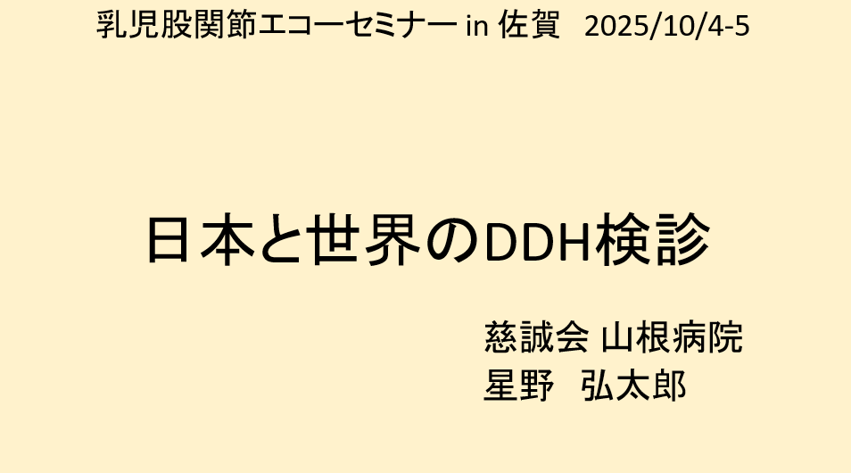 | 2025/6/19発表(愛知県) 第64回日本小児股関節研究会における主題1「1か月健診は股脱新時代へのブレークスルーとなりうるのか?」の中で、「我が国のDDH早期健診の歴史と欧州超音波検診の現状」を発表させていただきました。本会は子どもの股関節疾患について最も熱く議論できる会です。赤ちゃんの股関節チェックがこれまでの4か月児だけでなく、1か月児でもなされ、ダブルチェックが実現しようとしています。そこで重要になるのが超音波診断です。その重要性を解説させていただきました。生まれた赤ちゃん全員に股関節エコーができるのはいつの日か⁉ |
