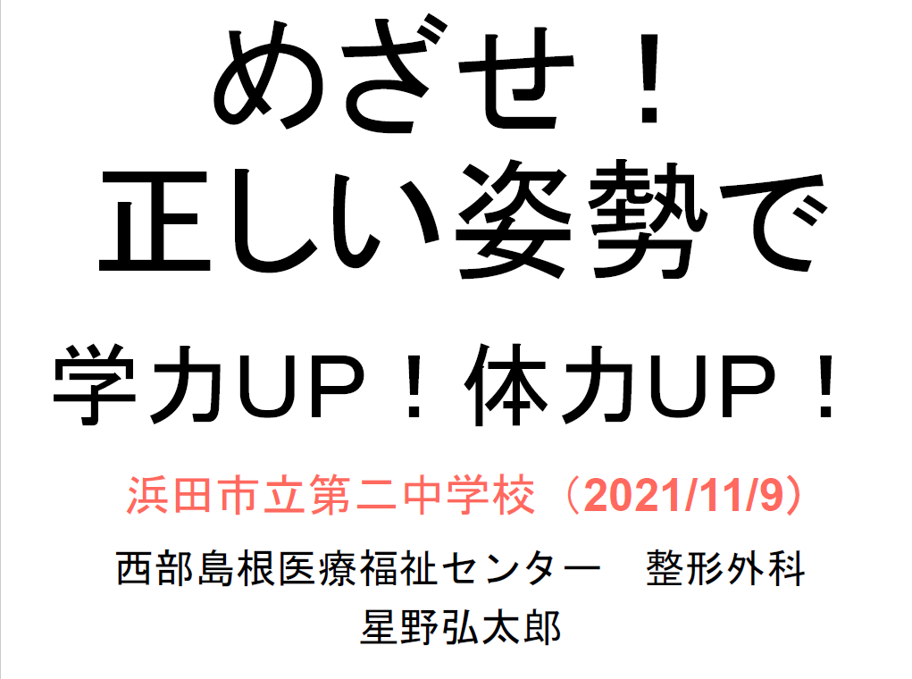 | 2021/11/17講演(島根県浜田市) 浜田市立浜田第二中学校に、昨年に続き2度目の訪問させていただきました。全校生徒42名に向けて、子どもたちの正しい姿勢をテーマに講演させていただきました。本テーマでの講演は、2017年から15回目になります。毎回バージョンアップして、よい姿勢のための4つの体操、勉強に大切な“勉強体力”、なぜ勉強しないといけないのか、ドクターにどうやってなったのか、など楽しくお話しさせていただきました。 |